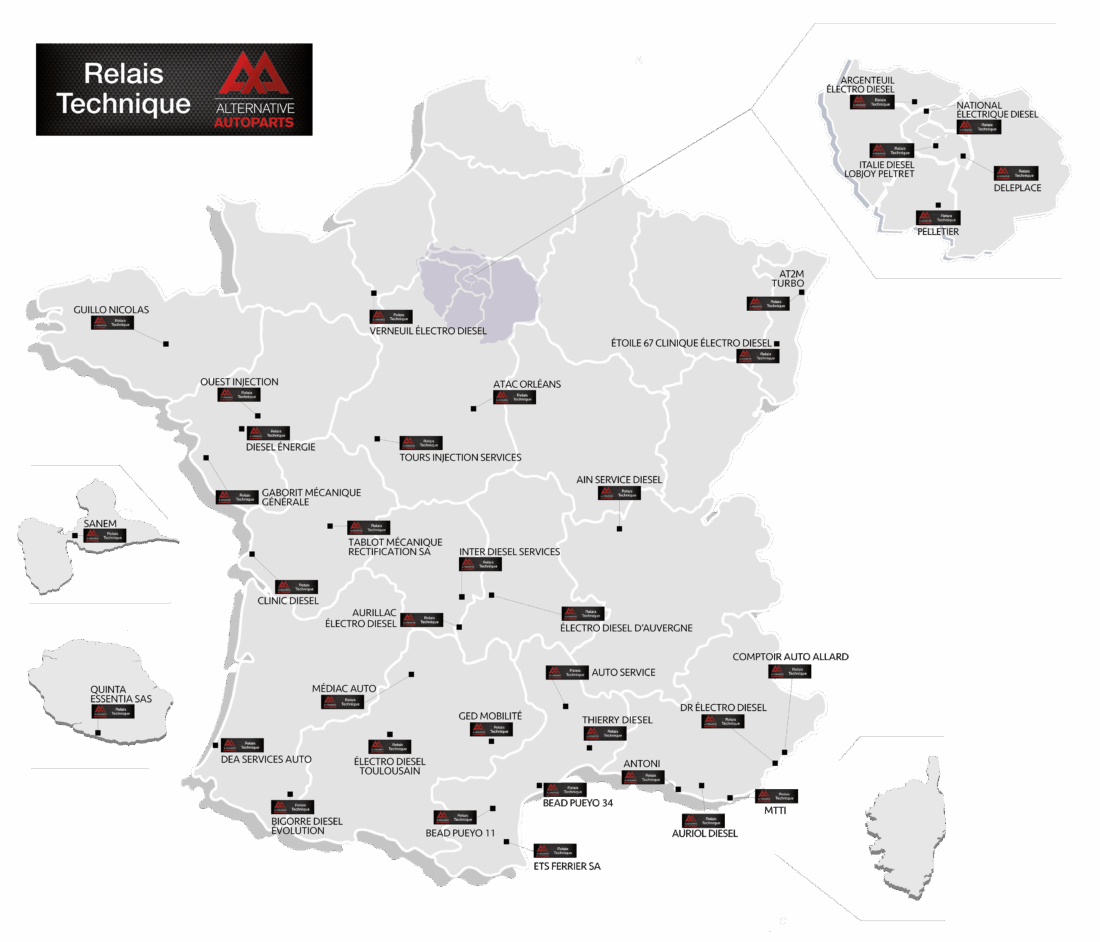 Le réseau de relais technique Alternative Autoparts s’étend sur tout le territoire français (France Hexagonale et certains DROM COM), offrant ainsi aux adhérents des partenaires techniques fiables et disponibles à l’échelle nationale.